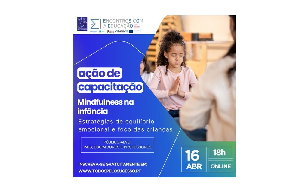 O projeto municipal de promoção do sucesso escolar “Encontros com a Educação” vai dinamizar uma nova ação de capacitação online (plataforma Zoom) no dia 16 de abril, pelas 18h00, com o tema “Mindfulness na Infância”. A participação é gratuita, mediante inscrição prévia aqui.