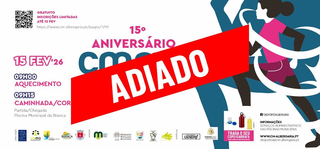 Devido às 𝗰𝗼𝗻𝗱𝗶çõ𝗲𝘀 𝗰𝗹𝗶𝗺𝗮𝘁é𝗿𝗶𝗰𝗮𝘀 𝗮𝗱𝘃𝗲𝗿𝘀𝗮𝘀 🌧️, o programa de atividades do 15.º Aniversário do Centro Municipal de Marcha e Corrida da Branca foi 𝗮𝗱𝗶𝗮𝗱𝗼, 𝗰𝗼𝗺 𝗱𝗮𝘁𝗮 𝗮 𝗱𝗲𝗳𝗶𝗻𝗶𝗿 𝗽𝗼𝘀𝘁𝗲𝗿𝗶𝗼𝗿𝗺𝗲𝗻𝘁𝗲.